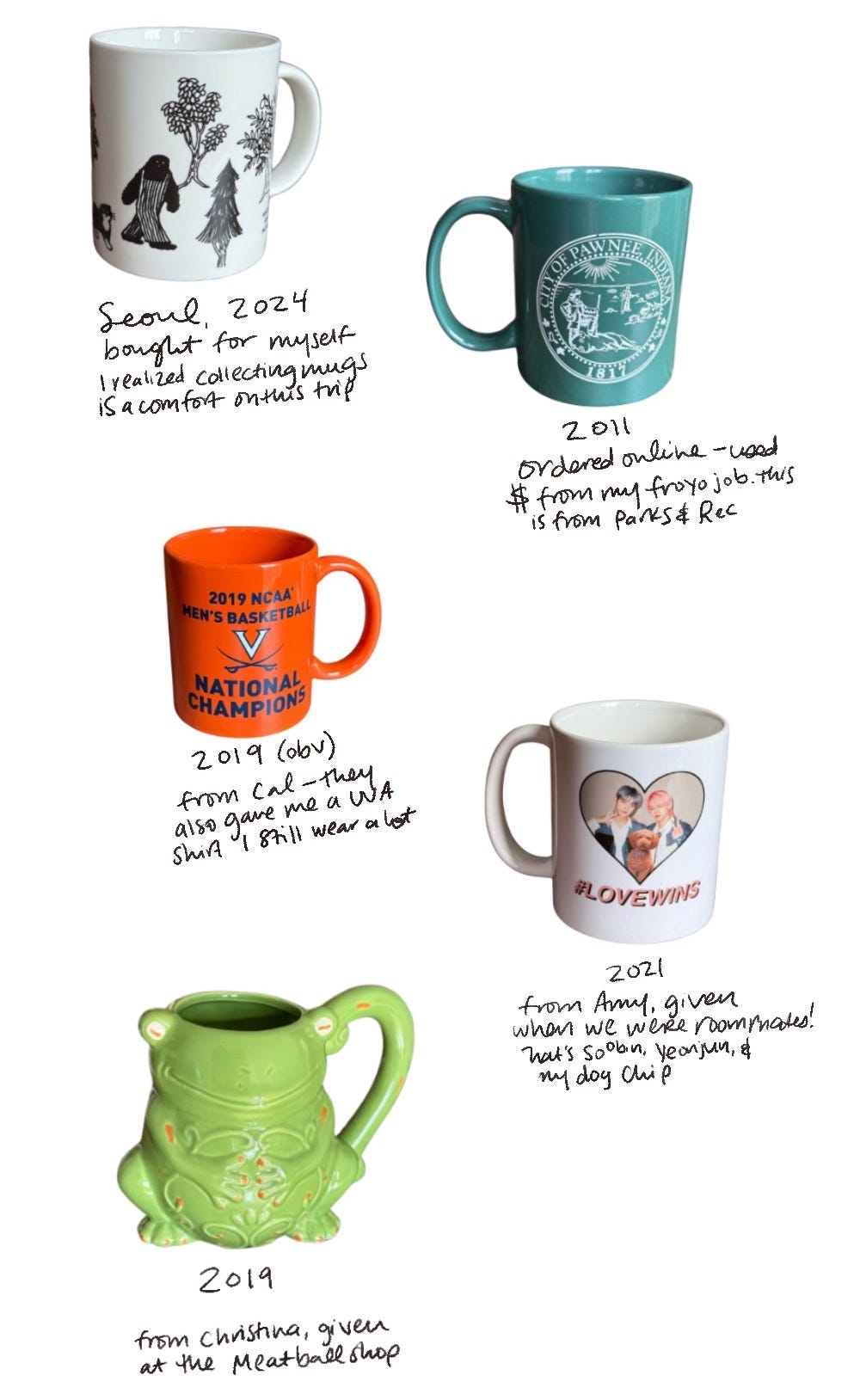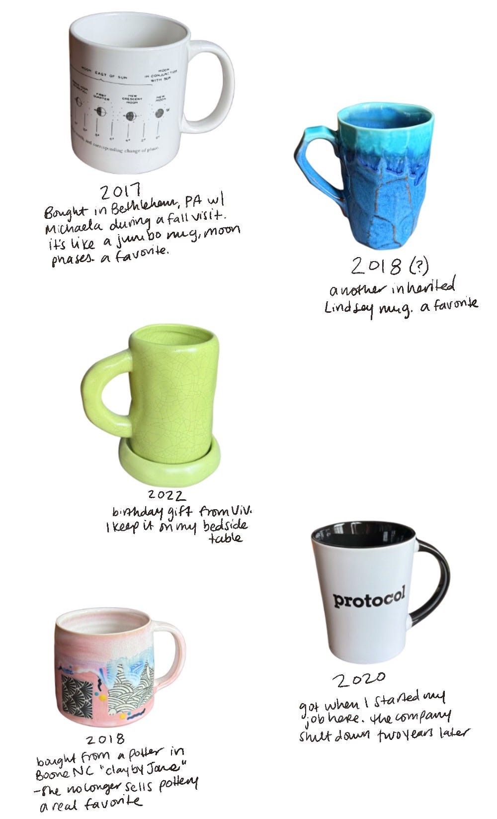 How many mugs do you have? How are you doing? Summer is so weird. It’s warm and slow and sad and the air feels like velvet on the East Coast. I have a headache and I wake up thinking about everything I need to do and everyone I need to get back to and then I sit very still in my bed for as long as possible. I’m thinking of you.