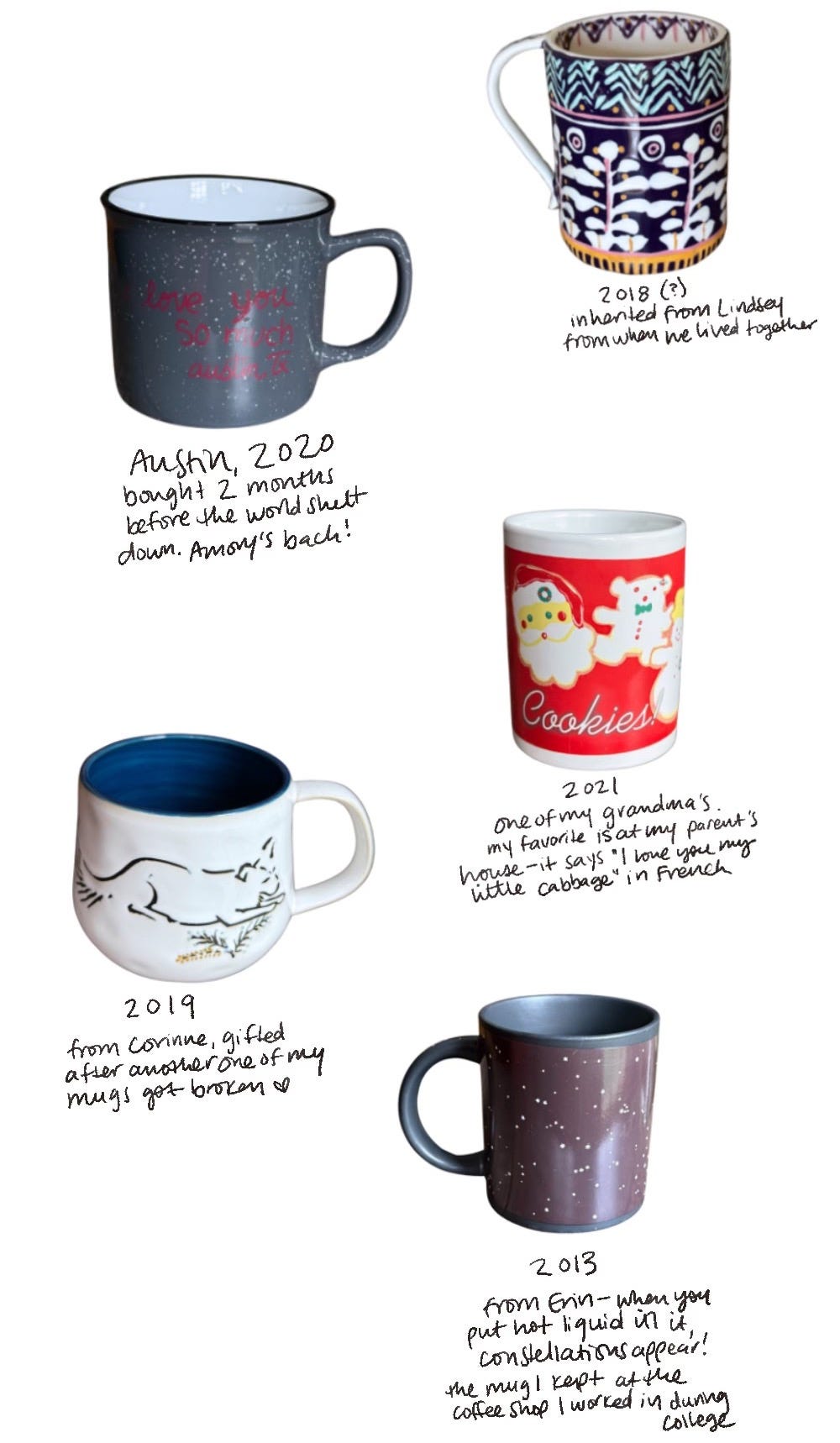 This isn’t all of my mugs. I have a few more in Brooklyn that I didn’t photograph (I ran out of energy) and I have quite a few in North Carolina that are even more sentimental because I’ve had them for like half my life.